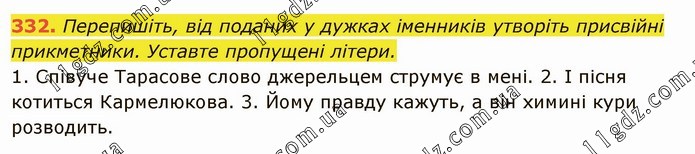 Перепишіть, від поданих у дужках іменників утворіть присвійні прикметники. Уставте пропущені літери. 1. Співуче Тарасове слово джерельцем струмує в мені. 2. І пісня котиться Кармелюкова. 3. Йому правду кажуть, а він химині кури розводить.