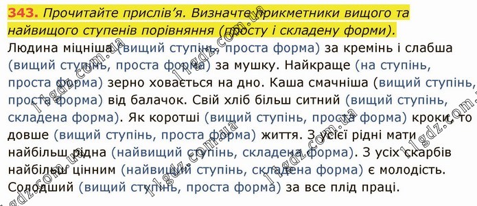 Прочитайте прислів’я. Визначте прикметники вищого та найвищого ступенів порівняння (просту і складену форми). Людина міцніша (вищий ступінь, проста форма) за кремінь і слабша (вищий ступінь, проста форма) за мушку. Найкраще (на ступінь, проста форма) зерно ховається на дно. Каша смачніша (вищий ступінь, проста форма) від балачок. Свій хліб більш ситний (вищий ступінь, складена форма). Як коротші (вищий ступінь, проста форма) кроки, то довше (вищий ступінь, проста форма) життя. З усієї рідні мати найбільш рідна (найвищий ступінь, складена форма). З усіх скарбів найбільш цінним (найвищий ступінь, складена форма) є молодість. Солодший (вищий ступінь, проста форма) за все плід праці.