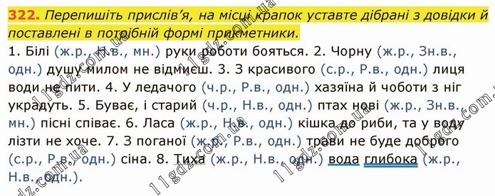Перепишіть прислів’я, на місці крапок уставте дібрані з довідки й поставлені в потрібній формі прикметники. 1. Білі (ж.р., Н.в., мн.) руки роботи бояться. 2. Чорну (ж.р., Зн.в., одн.) душу милом не відмиєш. 3. З красивого (с.р., Р.в., одн.) лиця води не пити. 4. У ледачого (ч.р., Р.в., одн.) хазяїна й чоботи з ніг украдуть. 5. Буває, і старий (ч.р., Н.в., одн.) птах нові (ж.р., Зн.в., мн.) пісні співає. 6. Ласа (ж.р., Н.в., одн.) кішка до риби, та у воду лізти не хоче. 7. З поганої (ж.р., Р.в., одн.) трави не буде доброго (с.р., Р.в., одн.) сіна. 8. Тиха (ж.р., Н.в., одн.) вода глибока (ж.р., Н.в., одн.).