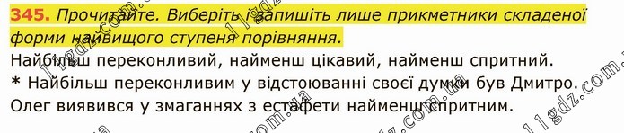 Прочитайте. Виберіть і запишіть лише прикметники складеної форми найвищого ступеня порівняння. Найбільш переконливий, найменш цікавий, найменш спритний. * Найбільш переконливим у відстоюванні своєї думки був Дмитро. Олег виявився у змаганнях з естафети найменш спритним.