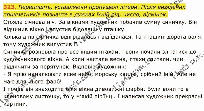Перепишіть, уставляючи пропущені літери. Після виділених прикметників позначте в дужках їхній рід, число, відмінок. Стояла січнева ніч. За вікнами художник побачив сумну синичку. Він відчинив вікно і впустив бідолашну пташку. Кілька днів синичка відігрівалась і від’їдалася. Та пташині дорога воля. тому художник випустив її. Синичка розповіла про все іншим птахам, і вони почали злітатися до художникового вікна. А коли настала весна, птахи спитали, чим віддячити за порятунок. Відповів художник: - Я мрію намалювати ясне небо, морську хвилю, срібний іній. Але не маю для цього фарб! І почав він знаходити біля вікна дивовижні фарби. Були вони то в кленовому листочку, то у м’якій пір’їнці. І написав художник прекрасні картини.