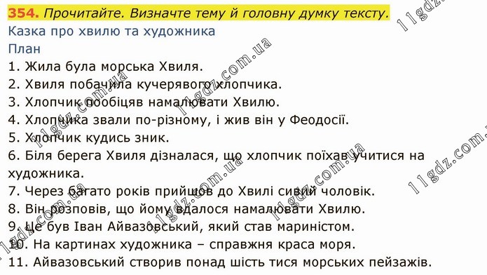 Прочитайте. Визначте тему й головну думку тексту. Казка про хвилю та художника План 1. Жила була морська Хвиля. 2. Хвиля побачила кучерявого хлопчика. 3. Хлопчик пообіцяв намалювати Хвилю. 4. Хлопчика звали по-різному, і жив він у Феодосії. 5. Хлопчик кудись зник. 6. Біля берега Хвиля дізналася, що хлопчик поїхав учитися на художника. 7. Через багато років прийшов до Хвилі сивий чоловік. 8. Він розповів, що йому вдалося намалювати Хвилю. 9. Це був Іван Айвазовський, який став мариністом. 10. На картинах художника – справжня краса моря. 11. Айвазовський створив понад шість тися морських пейзажів.