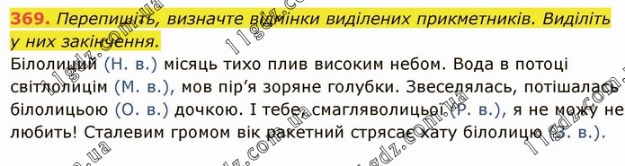 Перепишіть, визначте відмінки виділених прикметників. Виділіть у них закінчення. Білолиций (Н. в.) місяць тихо плив високим небом. Вода в потоці світлолицім (М. в.), мов пір’я зоряне голубки. Звеселялась, потішалась білолицьою (О. в.) дочкою. І тебе, смагляволицьої (Р. в.), я не можу не любить! Сталевим громом вік ракетний стрясає хату білолицю (3. в.).