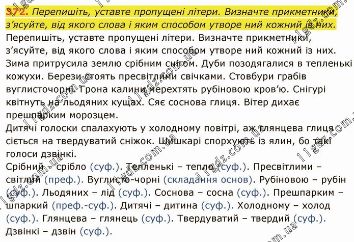 Перепишіть, уставте пропущені літери. Визначте прикметники, з’ясуйте, від якого слова і яким способом утворе ний кожний із них. Перепишіть, уставте пропущені літери. Визначте прикметники, з’ясуйте, від якого слова і яким способом утворе ний кожний із них. Зима притрусила землю срібним снігом. Дуби позодягалися в тепленькі кожухи. Берези стоять пресвітлими свічками. Стовбури грабів вуглисточорні. Грона калини мерехтять рубіновою кров’ю. Снігурі квітнуть на льодяних кущах. Сяє соснова глиця. Вітер дихає прешпарким морозцем. Дитячі голоски спалахують у холодному повітрі, аж глянцева глиця сіється на твердуватий сніжок. Шишкарі спорхують із ялин, бо такі голоси дзвінкі. Срібний – срібло (суф.). Тепленькі – тепло (суф.). Пресвітлими – світлий (преф.). Вуглисто-чорні (складання основ). Рубіновою – рубін (суф.). Льодяних – лід (суф.). Соснова – сосна (суф.). Прешпарким – шпаркий (преф.-суф.). Дитячі – дитина (суф.). Холодному – холод (суф.). Глянцева – глянець (суф.). Твердуватий – твердий (суф.). Дзвінкі – дзвін (суф.).