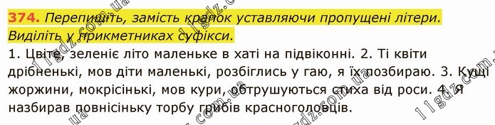 Перепишіть, замість крапок уставляючи пропущені літери. Виділіть у прикметниках суфікси. 1. Цвіте, зеленіє літо маленьке в хаті на підвіконні. 2. Ті квіти дрібненькі, мов діти маленькі, розбіглись у гаю, я їх позбираю. 3. Кущі жоржини, мокрісінькі, мов кури, обтрушуються стиха від роси. 4. Я назбирав повнісіньку торбу грибів красноголовців.