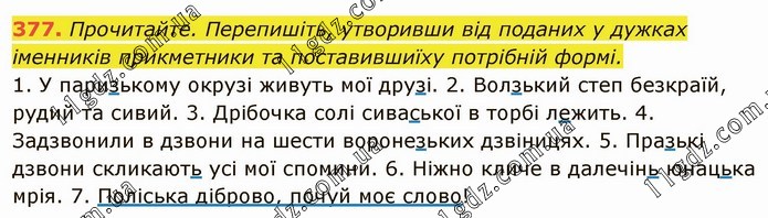 Прочитайте. Перепишіть, утворивши від поданих у дужках іменників прикметники та поставившиїху потрібній формі. 1. У паризькому окрузі живуть мої друзі. 2. Волзький степ безкраїй, рудий та сивий. 3. Дрібочка солі сиваської в торбі лежить. 4. Задзвонили в дзвони на шести воронезьких дзвіницях. 5. Празькі дзвони скликають усі мої спомини. 6. Ніжно кличе в далечінь юнацька мрія. 7. Поліська діброво, почуй моє слово!
