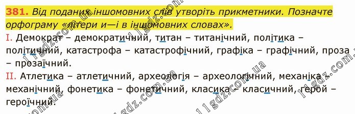Від поданих іншомовних слів утворіть прикметники. Позначте орфограму «літери и—і в іншомовних словах». І. Демократ – демократичний, титан – титанічний, політика – політичний, катастрофа – катастрофічний, графіка – графічний, проза – прозаїчний. ІІ. Атлетика – атлетичний, археологія – археологічний, механіка – механічний, фонетика – фонетичний, класика – класичний, герой – героїчний.