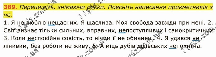 Перепишіть, знімаючи риски. Поясніть написання прикметників з не. 1. Я не люблю нещасних. Я щаслива. Моя свобода завжди при мені. 2. Світ визнає тільки сильних, вправних, непоступливих і самокритичних. 3. Коли неспокійна совість, то нічим її не обманеш. 4. Я удався не лінивим, без роботи не живу. 5. А міць дубів дідівських непохитна.