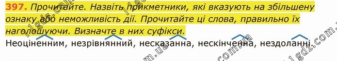 Прочитайте. Назвіть прикметники, які вказують на збільшену ознаку або неможливість дії. Прочитайте ці слова, правильно їх наголошуючи. Визначте в них суфікси. Неоціненним, незрівнянний, несказанна, нескінченна, нездоланні.