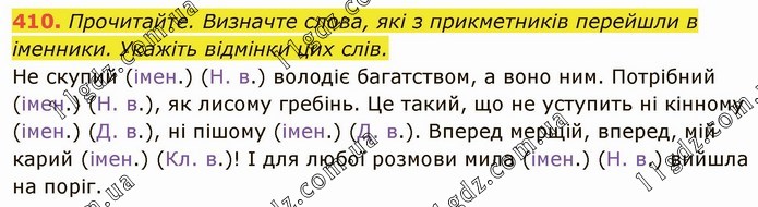 Прочитайте. Визначте слова, які з прикметників перейшли в іменники. Укажіть відмінки цих слів. Не скупий (імен.) (Н. в.) володіє багатством, а воно ним. Потрібний (імен.) (Н. в.), як лисому гребінь. Це такий, що не уступить ні кінному (імен.) (Д. в.), ні пішому (імен.) (Д. в.). Вперед мерщій, вперед, мій карий (імен.) (Кл. в.)! І для любої розмови мила (імен.) (Н. в.) вийшла на поріг.