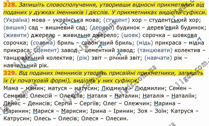 Запишіть словосполучення, утворивши відносні прикметники від поданих у дужках іменників і дієслів. У прикметниках виділіть суфікси. (Україна) мова – українська мова; (студент) хор – студентський хор; (вишня) сад – вишневий сад; (дерево) будинок – дерев’евий будинок; (живити) джерело – живильне джерело; (шовк) сорочка – шовкова сорочка; (солома) бриль – солом’яний бриль; (мідь) прикраса – мідна прикраса; (цемент) завод – цементний завод; (танцювати) колектив – танцювальний колектив; (рік) звіт – річний звіт; (навчати) рік – навчальний рік. 329. Від поданих іменників утворіть присвійні прикметники, запишіть їх (у початковій формі), виділіть у них суфікси. Мама – мамин; матуся – матусин; Людмила – Людмилин; Семен – Семенів; Олексій – Олексіїв; Наталя – Наталин; Наталія – Наталіїн; Денис – Денисів; Сергій – Сергіїв; Олег – Олежчин; Марина – Маринин; Марися – Марисин; Ірина – Іринин; Зоя – Зоїн; Катруся – Катрусин; Олесь – Олесів; Олеся – Олесин.