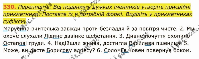 Перепишіть. Від поданих у дужках іменників утворіть присвійні прикметники. Поставте їх у потрібній формі. Виділіть у прикметниках суфікси. Марусина вчителька завжди проти безладдя й за повітря чисте. 2. Ми охоче слухали Лідине дзвінке щебетання. 3. Дивне почуття охопило Остапові груди. 4. Надійшли жнива, достигла Василева пшениця. 5. Може, ви дасте Борисову адресу? 6. Соломіїв човен повернув боком.