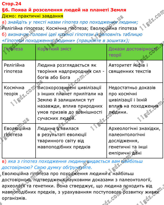 §6. Поява й розселення людей на планеті Земля Діємо: практичні завдання а) знайдіть у тексті назви гіпотез про походження людини; Релігійна гіпотеза; Космічна гіпотеза; Еволюційна гіпотеза б) визначте головні ідеї кожної гіпотези й заповніть таблицю «Гіпотези походження людини» (працюйте в зошитах); Гіпотеза Короткий зміст Докази достовірності теорії Релігійна гіпотеза Людина розглядається як творіння надприродних сил - богів або Бога Авторитет міфів і священних текстів Космічна теорія Високорозвинені цивілізації з інших планет прилітали на Землю й залишилися тут назавжди, вплив природних умов призвів до зовнішності сучасних людей. Недостатньо доказів про космічні цивілізації і їхній вплив на походження людини. Еволюційна гіпотеза Людина з'явилася в результаті еволюції тваринного світу від мавпоподібних предків Археологічні знахідки, палеонтологічні дослідження, генетичні та інші емпіричні дані в) яка з гіпотез походження людини видається вам найбільш достовірною? Свою думку обґрунтуйте. Еволюційна гіпотеза про походження людини є найбільш достовірною, підтверджена науковими доказами з палеонтології, археології та генетики. Вона стверджує, що людина походить від мавпоподібних предків, з урахуванням поступового розвитку живих організмів.