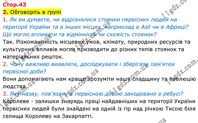 2. Обговоріть в групі 1. Як ви думаєте, чи відрізнялися стоянки первісних людей на території України та в інших місцях, наприклад в Азії чи в Африці? Що могло впливати та відмінність чи схожість стоянок? Так. Різноманітність місцевих умов, клімату, природних ресурсів та культурних впливів могла призводити до різних типів стоянок та матеріальних решток. 2. Чому важливо виявляти, досліджувати і зберігати пам'ятки первісної доби? Вони допомагають нам краще зрозуміти нашу спадщину та еволюцію людства. 3. Яку назву, пов’язану з первісною добою закодовано в ребусі? Королеве - залишки знарядь праці найдавніших на території України первісних людей були знайдені на одній із гір над річкою Тисою біля селища Королево на Закарпатті.