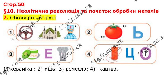 §10. Неолітична революція та початок обробки металів 2. Обговоріть в групі 1) кераміка ; 2) мідь; 3) ремесло; 4) ткацтво.