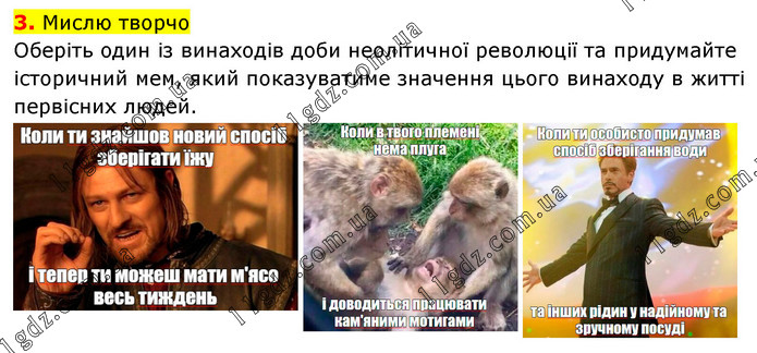 3. Мислю творчо Оберіть один із винаходів доби неолітичної революції та придумайте історичний мем, який показуватиме значення цього винаходу в житті первісних людей.