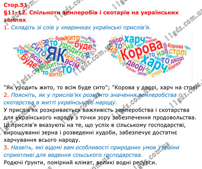 §11-12. Спільноти землеробів і скотарів на українських землях 1. Складіть зі слів у хмаринках українські прислів’я. "Як уродить жито, то всім буде сито"; "Корова у дворі, харч на столі" 2. Поясніть, як у прислів’ях розкрито значення землеробства і скотарства в житті українського народу. У прислів'ях розкривається важливість землеробства і скотарства для українського народу з точки зору забезпечення продовольства. Ці прислів'я вказують на те, що успіх в сільському господарстві, вирощуванні зерна і розведенні худоби, забезпечує достатнє харчування всього народу. 3. Назвіть, які відомі вам особливості природних умов України сприятливі для ведення сільського господарства. Родючі ґрунти, помірний клімат, великі водні ресурси.