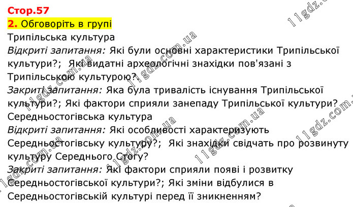 2. Обговоріть в групі Трипільська культура Відкриті запитання: Які були основні характеристики Трипільської культури?; Які видатні археологічні знахідки пов'язані з Трипільською культурою?. Закриті запитання: Яка була тривалість існування Трипільської культури?; Які фактори сприяли занепаду Трипільської культури? Середньостогівська культура Відкриті запитання: Які особливості характеризують Середньостогівську культуру?; Які знахідки свідчать про розвинуту культуру Середнього Стогу? Закриті запитання: Які фактори сприяли появі і розвитку Середньостогівської культури?; Які зміни відбулися в Середньостогівській культурі перед її зникненням?