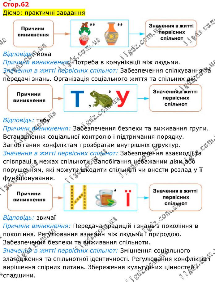 Діємо: практичні завдання Відповідь: мова Причини виникнення: Потреба в комунікації між людьми. Значення в житті первісних спільнот: Забезпечення спілкування та передачі знань. Організація соціального життя та спільних дій. Відповідь: табу Причини виникнення: Забезпечення безпеки та виживання групи. Встановлення соціальної контролю і підтримання порядку. Запобігання конфліктам і розбратам внутрішніх структур. Значення в житті первісних спільнот: Забезпечення взаємодії та співпраці в межах спільноти. Запобігання небажаним діям або порушенням, які можуть шкодити спільноті чи внести розлад у її функціонування. Відповідь: звичаї Причини виникнення: Передача традицій і знань з покоління в покоління. Регулювання взаємин між людьми і природою. Забезпечення безпеки та виживання спільноти. Значення в житті первісних спільнот: Зміцнення соціального злагодження та спільнотної ідентичності. Регулювання конфліктів і вирішення спірних питань. Збереження культурних цінностей і спадщини.