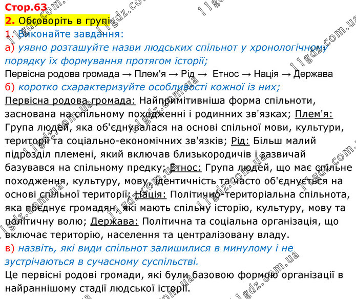 2. Обговоріть в групі 1. Виконайте завдання: а) уявно розташуйте назви людських спільнот у хронологічному порядку їх формування протягом історії; Первісна родова громада → Плем'я → Рід → Етнос → Нація → Держава б) коротко схарактеризуйте особливості кожної із них; Первісна родова громада: Найпримітивніша форма спільноти, заснована на спільному походженні і родинних зв'язках; Плем'я: Група людей, яка об'єднувалася на основі спільної мови, культури, території та соціально-економічних зв'язків; Рід: Більш малий підрозділ племені, який включав близькородичів і зазвичай базувався на спільному предку; Етнос: Група людей, що має спільне походження, культуру, мову, ідентичність та часто об'єднується на основі спільної території; Нація: Політично-територіальна спільнота, яка поєднує громадян, які мають спільну історію, культуру, мову та політичну волю; Держава: Політична та соціальна організація, що включає територію, населення та централізовану владу. в) назвіть, які види спільнот залишилися в минулому і не зустрічаються в сучасному суспільстві. Це первісні родові громади, які були базовою формою організації в найраннішому стадії людської історії.