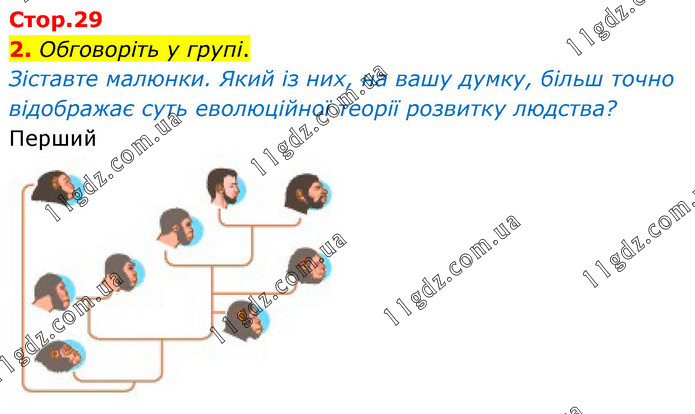 2. Обговоріть у групі. Зіставте малюнки. Який із них, на вашу думку, більш точно відображає суть еволюційної теорії розвитку людства? Перший