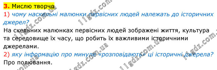 3. Мислю творчо 1) чому наскельні малюнки первісних людей належать до історичних джерел? На скельних малюнках первісних людей зображені життя, культура та середовище їх часу, що робить їх важливими історичними джерелами. 2) яку інформацію про минуле «розповідають» ці історичні джерела? Про полювання.