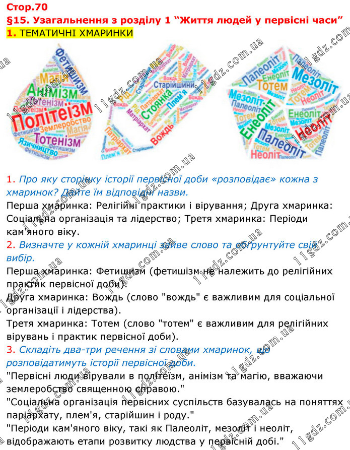 §15. Узагальнення з розділу 1 “Життя людей у первісні часи” 1. ТЕМАТИЧНІ ХМАРИНКИ 1. Про яку сторінку історії первісної доби «розповідає» кожна з хмаринок? Дайте їм відповідні назви. Перша хмаринка: Релігійні практики і вірування; Друга хмаринка: Соціальна організація та лідерство; Третя хмаринка: Періоди кам'яного віку. 2. Визначте у кожній хмаринці зайве слово та обґрунтуйте свій вибір. Перша хмаринка: Фетишизм (фетишізм не належить до релігійних практик первісної доби). Друга хмаринка: Вождь (слово "вождь" є важливим для соціальної організації і лідерства). Третя хмаринка: Тотем (слово "тотем" є важливим для релігійних вірувань і практик первісної доби). 3. Складіть два-три речення зі словами хмаринок, що розповідатимуть історії первісної доби. "Первісні люди вірували в політеїзм, анімізм та магію, вважаючи землеробство священною справою." "Соціальна організація первісних суспільств базувалась на поняттях паріархату, плем'я, старійшин і роду." "Періоди кам'яного віку, такі як Палеоліт, мезоліт і неоліт, відображають етапи розвитку людства у первісній добі."