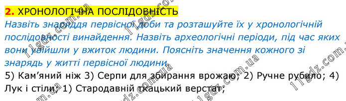 2. ХРОНОЛОГІЧНА ПОСЛІДОВНІСТЬ Назвіть знаряддя первісної доби та розташуйте їх у хронологічній послідовності винайдення. Назвіть археологічні періоди, під час яких вони увійшли у вжиток людини. Поясніть значення кожного зі знарядь у житті первісної людини. 5) Кам’яний ніж 3) Серпи для збирання врожаю; 2) Ручне рубило; 4) Лук і стіли; 1) Стародавній ткацький верстат;