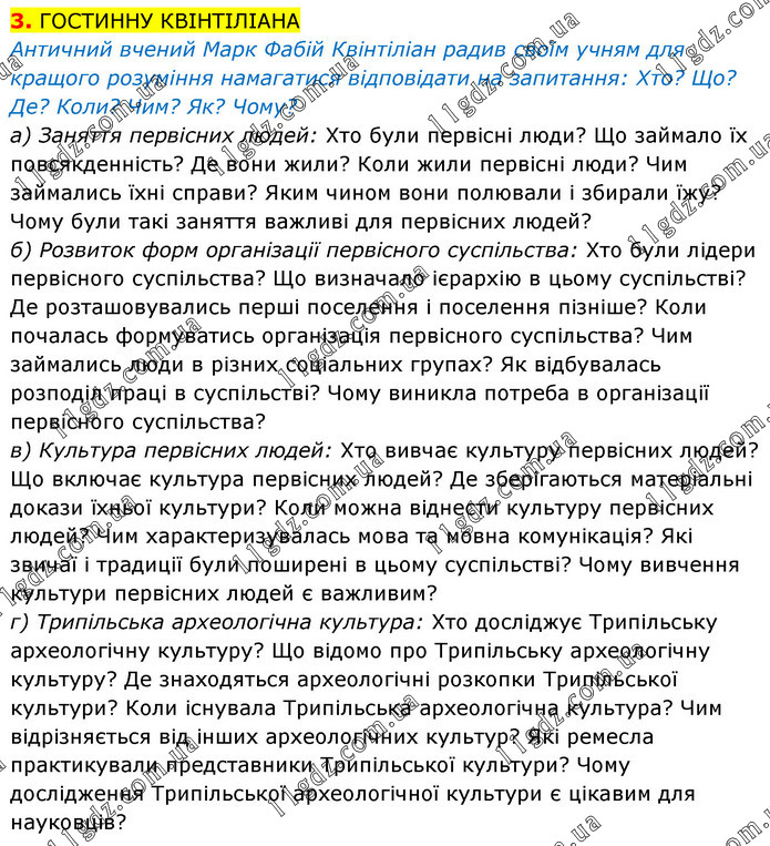 3. ГОСТИННУ КВІНТІЛІАНА Античний вчений Марк Фабій Квінтіліан радив своїм учням для кращого розуміння намагатися відповідати на запитання: Хто? Що? Де? Коли? Чим? Як? Чому? а) Заняття первісних людей: Хто були первісні люди? Що займало їх повсякденність? Де вони жили? Коли жили первісні люди? Чим займались їхні справи? Яким чином вони полювали і збирали їжу? Чому були такі заняття важливі для первісних людей? б) Розвиток форм організації первісного суспільства: Хто були лідери первісного суспільства? Що визначало ієрархію в цьому суспільстві? Де розташовувались перші поселення і поселення пізніше? Коли почалась формуватись організація первісного суспільства? Чим займались люди в різних соціальних групах? Як відбувалась розподіл праці в суспільстві? Чому виникла потреба в організації первісного суспільства? в) Культура первісних людей: Хто вивчає культуру первісних людей? Що включає культура первісних людей? Де зберігаються матеріальні докази їхньої культури? Коли можна віднести культуру первісних людей? Чим характеризувалась мова та мовна комунікація? Які звичаї і традиції були поширені в цьому суспільстві? Чому вивчення культури первісних людей є важливим? г) Трипільська археологічна культура: Хто досліджує Трипільську археологічну культуру? Що відомо про Трипільську археологічну культуру? Де знаходяться археологічні розкопки Трипільської культури? Коли існувала Трипільська археологічна культура? Чим відрізняється від інших археологічних культур? Які ремесла практикували представники Трипільської культури? Чому дослідження Трипільської археологічної культури є цікавим для науковців?
