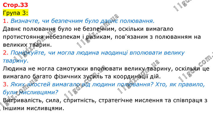 Група 3: 1. Визначте, чи безпечним було давнє полювання. Давнє полювання було не безпечним, оскільки вимагало протистояння небезпекам і ризикам, пов'язаним з полюванням на великих тварин. 2. Поміркуйте, чи могла людина наодинці вполювати велику тварину. Людина не могла самотужки вполювати велику тварину, оскільки це вимагало багато фізичних зусиль та координації дій. 3. Яких якостей вимагало від людини полювання? Хто, як правило, були мисливцями? Витривалість, сила, спритність, стратегічне мислення та співпраця з іншими мисливцями.