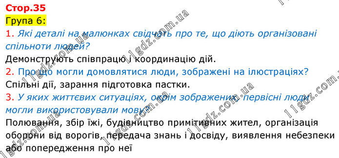 Група 6: 1. Які деталі на малюнках свідчать про те, що діють організовані спільноти людей? Демонструють співпрацю і координацію дій. 2. Про що могли домовлятися люди, зображені на ілюстраціях? Спільні дії, зарання підготовка пастки. 3. У яких життєвих ситуаціях, окрім зображених, первісні люди могли використовували мову? Полювання, збір їжі, будівництво примітивних жител, організація оборони від ворогів, передача знань і досвіду, виявлення небезпеки або попередження про неї