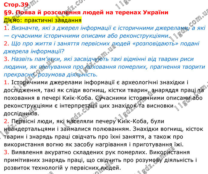 §9. Поява й розселення людей на теренах України Діємо: практичні завдання 1. Визначте, які з джерел інформації є історичними джерелами, а які — сучасними історичними описами або реконструкціями. 2. Що про життя і заняття первісних людей «розповідають» подані джерела інформації? 3. Назвіть пам’ятки, які засвідчують такі відмінні від тварин риси людини, як піклування про поховання померлих, прагнення творити прекрасне, розумова діяльність. 1. Історичними джерелами інформації є археологічні знахідки і дослідження, такі як сліди вогнищ, кістки тварин, знаряддя праці та поховання в печері Киїк-Коба. Сучасними історичними описами або реконструкціями є інтерпретації цих знахідок та висновки дослідників. 2. Первісні люди, які населяли печеру Киїк-Коба, були неандертальцями і займалися полюванням. Знахідки вогнищ, кісток тварин і знарядь праці свідчать про їхні заняття, а також про використання вогню як засобу нагрівання і приготування їжі. 3. Виявлення акуратно складених рук померлих. Використання примітивних знарядь праці, що свідчить про розумову діяльність і розвиток технологій у первісних людей.