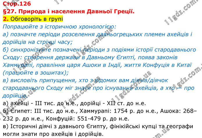 §27. Природа і населення Давньої Греції. 2. Обговоріть в групі Попрацюйте з історичною хронологією: а) позначте періоди розселення давньогрецьких племен ахейців і дорійців на стрічці часу; б) синхронізуйте позначені періоди з подіями історії стародавнього Сходу: створення держави в Давньому Єгипті, поява законів Хаммурапі, правління царя Ашоки в Індії, життя Конфуція в Китаї (працюйте в зошитах); в) висловіть припущення, хто з відомих вам діячів/діячок стародавнього Сходу міг знати про існування ахейців, а хто — про дорійців. а) ахейці - III тис. до н.е., дорійці - XII ст. до н.е. б) Єгипет: III тис. до н.е., Хаммурапі: 1754 р. до н.е., Ашока: 268–232 р. до н.е., Конфуцій: 551-479 р. до н.е. в) Історичні діячі з давнього Єгипту, фінікійські купці та географи могли знати про ахейців і дорійців.