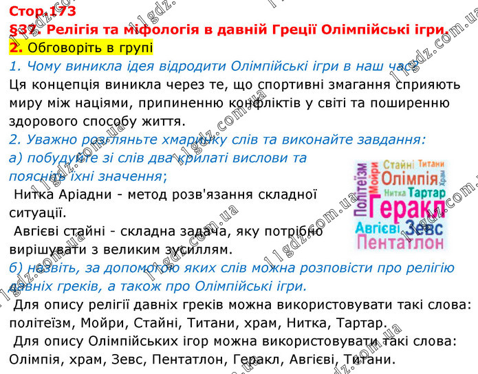 §37. Релігія та міфологія в давній Греції Олімпійські ігри. 2. Обговоріть в групі 1. Чому виникла ідея відродити Олімпійські ігри в наш час? Ця концепція виникла через те, що спортивні змагання сприяють миру між націями, припиненню конфліктів у світі та поширенню здорового способу життя. 2. Уважно розгляньте хмаринку слів та виконайте завдання: а) побудуйте зі слів два крилаті вислови та поясніть їхні значення; Нитка Аріадни - метод розв'язання складної ситуації. Авгієві стайні - складна задача, яку потрібно вирішувати з великим зусиллям. б) назвіть, за допомогою яких слів можна розповісти про релігію давніх греків, а також про Олімпійські ігри. Для опису релігії давніх греків можна використовувати такі слова: політеїзм, Мойри, Стайні, Титани, храм, Нитка, Тартар. Для опису Олімпійських ігор можна використовувати такі слова: Олімпія, храм, Зевс, Пентатлон, Геракл, Авгієві, Титани.