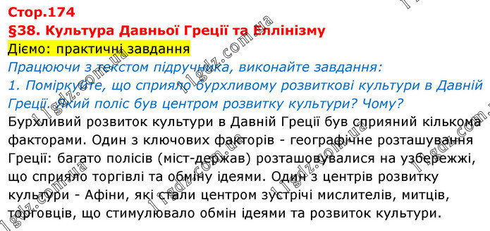 §38. Культура Давньої Греції та Еллінізму Діємо: практичні завдання Працюючи з текстом підручника, виконайте завдання: 1. Поміркуйте, що сприяло бурхливому розвиткові культури в Давній Греції. Який поліс був центром розвитку культури? Чому? Бурхливий розвиток культури в Давній Греції був сприяний кількома факторами. Один з ключових факторів - географічне розташування Греції: багато полісів (міст-держав) розташовувалися на узбережжі, що сприяло торгівлі та обміну ідеями. Один з центрів розвитку культури - Афіни, які стали центром зустрічі мислителів, митців, торговців, що стимулювало обмін ідеями та розвиток культури.