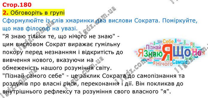 2. Обговоріть в групі Сформулюйте із слів хмаринки два вислови Сократа. Поміркуйте, що мав філософ на увазі. "Я знаю тільки те, що нічого не знаю" - цим висловом Сократ виражає гумільну покору перед незнанням і відкритість до вивчення нового, вказуючи на обмеженість нашого розуміння світу. "Пізнай самого себе" - це заклик Сократа до самопізнання та роздумів про власні риси, переконання і дії. Він покликав до внутрішнього рефлексу та розуміння свого власного "я".
