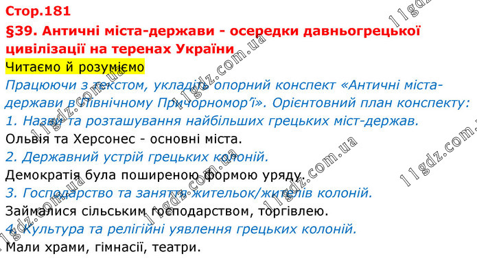 §39. Античні міста-держави - осередки давньогрецької цивілізації на теренах України Читаємо й розуміємо Працюючи з текстом, укладіть опорний конспект «Античні міста-держави в Північному Причорномор’ї». Орієнтовний план конспекту: 1. Назви та розташування найбільших грецьких міст-держав. Ольвія та Херсонес - основні міста. 2. Державний устрій грецьких колоній. Демократія була поширеною формою уряду. 3. Господарство та заняття жительок/жителів колоній. Займалися сільським господарством, торгівлею. 4. Культура та релігійні уявлення грецьких колоній. Мали храми, гімнасії, театри.