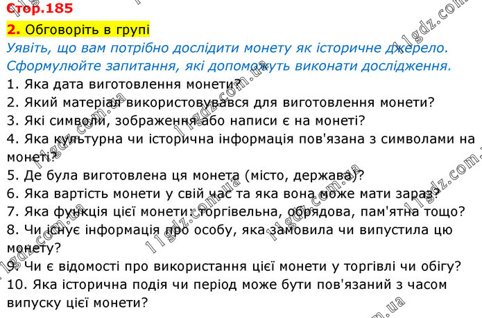 2. Обговоріть в групі Уявіть, що вам потрібно дослідити монету як історичне джерело. Сформулюйте запитання, які допоможуть виконати дослідження. 1. Яка дата виготовлення монети? 2. Який матеріал використовувався для виготовлення монети? 3. Які символи, зображення або написи є на монеті? 4. Яка культурна чи історична інформація пов'язана з символами на монеті? 5. Де була виготовлена ця монета (місто, держава)? 6. Яка вартість монети у свій час та яка вона може мати зараз? 7. Яка функція цієї монети: торгівельна, обрядова, пам'ятна тощо? 8. Чи існує інформація про особу, яка замовила чи випустила цю монету? 9. Чи є відомості про використання цієї монети у торгівлі чи обігу? 10. Яка історична подія чи період може бути пов'язаний з часом випуску цієї монети?