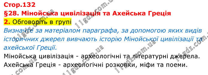 §28. Мінойська цивілізація та Ахейська Греція 2. Обговоріть в групі Визначте за матеріалом параграфа, за допомогою яких видів історичних джерел вивчають історію Мінойської цивілізації та ахейської Греції. Мінойська цивілізація - археологічні та літературні джерела. Ахейська Греція - археологічні розкопки, міфи та поеми.