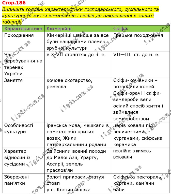 Випишіть головні характеристики господарського, суспільного та культурного життя кіммерійців і скіфів до накресленої в зошиті таблиці. Характеристика Кіммерійці Скіфи Походження Кіммерійці швидше за все були нащадками племен зрубної культури Грецьке походження Час перебування на теренах України в X-VII століттях до н. е. VII—III ст. до н. е. Заняття кочове скотарство, ремесла Скіфи-кочівники – розводили коней. Скіфи-орачі і скіфи-землероби вели осілий спосіб життя і займалися землеробством Особливості культури іранська мова, мешкали в наметах або критих возах, Жили патріархальними родами царів ховали під величезними курганами, скіфська керамика Характер відносин із сусідами Здійснили воєнні походи до Малої Азії, Урарту, Ассирії, земель праслов’ян постійно з кимось воювали Збережені пам’ятки Золоті прикраси, статуя-стовп у с. Костянтинівка Скіфська пектораль, кургани, кам’яни баби