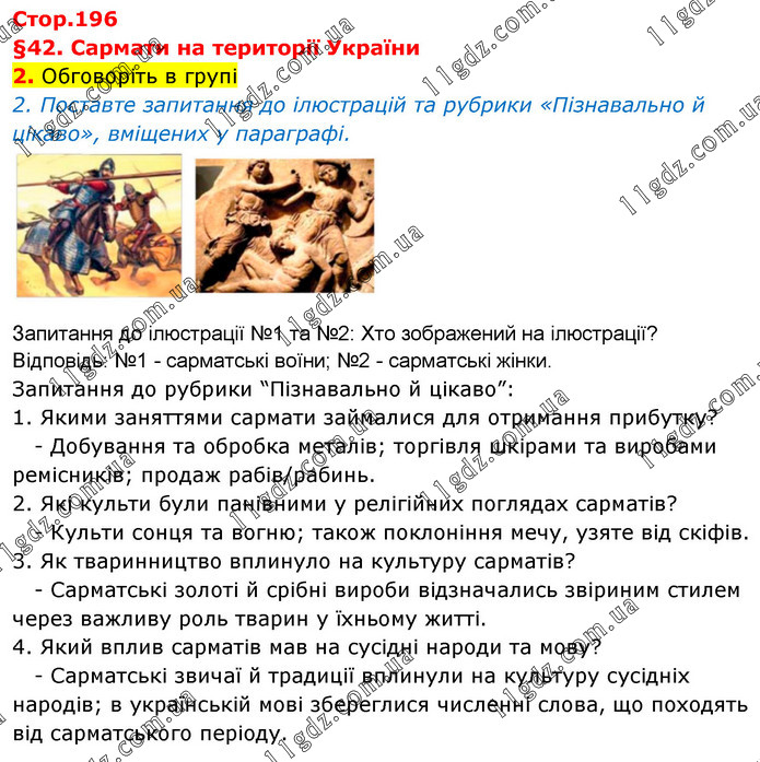 §42. Сармати на території України 2. Обговоріть в групі 2. Поставте запитання до ілюстрацій та рубрики «Пізнавально й цікаво», вміщених у параграфі. Запитання до ілюстрації №1 та №2: Хто зображений на ілюстрації? Відповідь: №1 - сарматські воїни; №2 - сарматські жінки. Запитання до рубрики “Пізнавально й цікаво”: 1. Якими заняттями сармати займалися для отримання прибутку? - Добування та обробка металів; торгівля шкірами та виробами ремісників; продаж рабів/рабинь. 2. Які культи були панівними у релігійних поглядах сарматів? - Культи сонця та вогню; також поклоніння мечу, узяте від скіфів. 3. Як тваринництво вплинуло на культуру сарматів? - Сарматські золоті й срібні вироби відзначались звіриним стилем через важливу роль тварин у їхньому житті. 4. Який вплив сарматів мав на сусідні народи та мову? - Сарматські звичаї й традиції вплинули на культуру сусідніх народів; в українській мові збереглися численні слова, що походять від сарматського періоду.