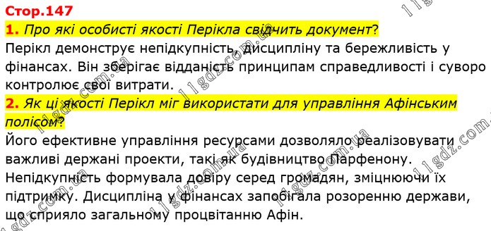 1. Про які особисті якості Перікла свідчить документ? Перікл демонструє непідкупність, дисципліну та бережливість у фінансах. Він зберігає відданість принципам справедливості і суворо контролює свої витрати. 2. Як ці якості Перікл міг використати для управління Афінським полісом? Його ефективне управління ресурсами дозволяло реалізовувати важливі держані проекти, такі як будівництво Парфенону. Непідкупність формувала довіру серед громадян, зміцнюючи їх підтримку. Дисципліна у фінансах запобігала розоренню держави, що сприяло загальному процвітанню Афін.