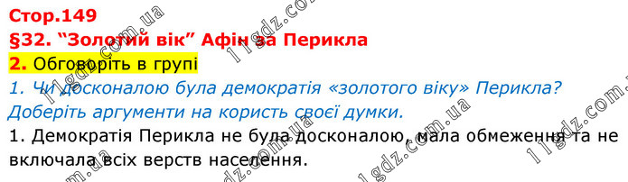 §32. “Золотий вік” Афін за Перикла 2. Обговоріть в групі 1. Чи досконалою була демократія «золотого віку» Перикла? Доберіть аргументи на користь своєї думки. 1. Демократія Перикла не була досконалою, мала обмеження та не включала всіх верств населення.