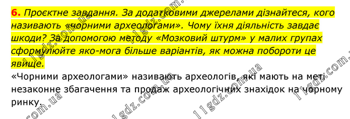 Проєктне завдання. За додатковими джерелами дізнайтеся, кого називають «чорними археологами». Чому їхня діяльність завдає шкоди? За допомогою методу «Мозковий штурм» у малих групах сформулюйте якомога більше варіантів, як можна побороти це явище. «Чорними археологами» називають археологів, які мають на меті незаконне збагачення та продаж археологічних знахідок на чорному ринку.