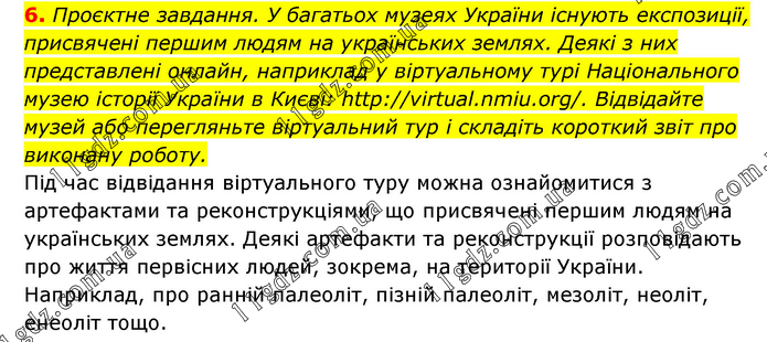 Проєктне завдання. У багатьох музеях України існують експозиції, присвячені першим людям на українських землях. Деякі з них представлені онлайн, наприклад у віртуальному турі Національного музею історії України в Києві: http://virtual.nmiu.org/. Відвідайте музей або перегляньте віртуальний тур і складіть короткий звіт про виконану роботу. Під час відвідання віртуального туру можна ознайомитися з артефактами та реконструкціями, що присвячені першим людям на українських землях. Деякі артефакти та реконструкції розповідають про життя первісних людей, зокрема, на території України. Наприклад, про ранній палеоліт, пізній палеоліт, мезоліт, неоліт, енеоліт тощо.
