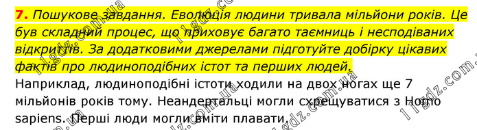 Пошукове завдання. Еволюція людини тривала мільйони років. Це був складний процес, що приховує багато таємниць і несподіваних відкриттів. За додатковими джерелами підготуйте добірку цікавих фактів про людиноподібних істот та перших людей. Наприклад, людиноподібні істоти ходили на двох ногах ще 7 мільйонів років тому. Неандертальці могли схрещуватися з Homo sapiens. Перші люди могли вміти плавати.