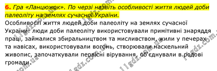 Гра «Ланцюжок». По черзі назвіть особливості життя людей доби палеоліту на землях сучасної України. Особливості життя людей доби палеоліту на землях сучасної України: люди доби палеоліту використовували примітивні знаряддя праці, займалися збиральництвом та мисливством, жили у печерах та навісах, використовували вогонь, створювали наскельний живопис, започаткували первісні вірування, об'єднували в родові громади.