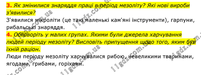 3. Як змінилися знаряддя праці в період мезоліту? Які нові вироби з’явилися? З'явилися мікроліти (це такі маленькі кам'яні інструменти), гарпуни, рибальські знаряддя. 4. Обговоріть у малих групах. Якими були джерела харчування людей періоду мезоліту? Висловіть припущення щодо того, яким був їхній раціон. Люди періоду мезоліту харчувалися рибою, невеликими тваринами, ягодами, грибами, горіхами.