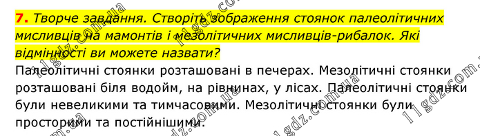 Творче завдання. Створіть зображення стоянок палеолітичних мисливців на мамонтів і мезолітичних мисливців-рибалок. Які відмінності ви можете назвати? Палеолітичні стоянки розташовані в печерах. Мезолітичні стоянки розташовані біля водойм, на рівнинах, у лісах. Палеолітичні стоянки були невеликими та тимчасовими. Мезолітичні стоянки були просторими та постійнішими.