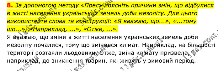 За допомогою методу «Прес» поясніть причини змін, що відбулися в житті населення українських земель доби мезоліту. Для цього використайте слова та конструкції: «Я вважаю, що...», «...тому що...», «Наприклад, ...», «Отже, ...». Я вважаю, що зміни в житті населення українських земель доби мезоліту почалися, тому що змінився клімат. Наприклад, на більшості території розтаяли льодовики. Отже, зміна клімату призвела, наприклад, до зникнення тварин, які живуть у зимовий період.